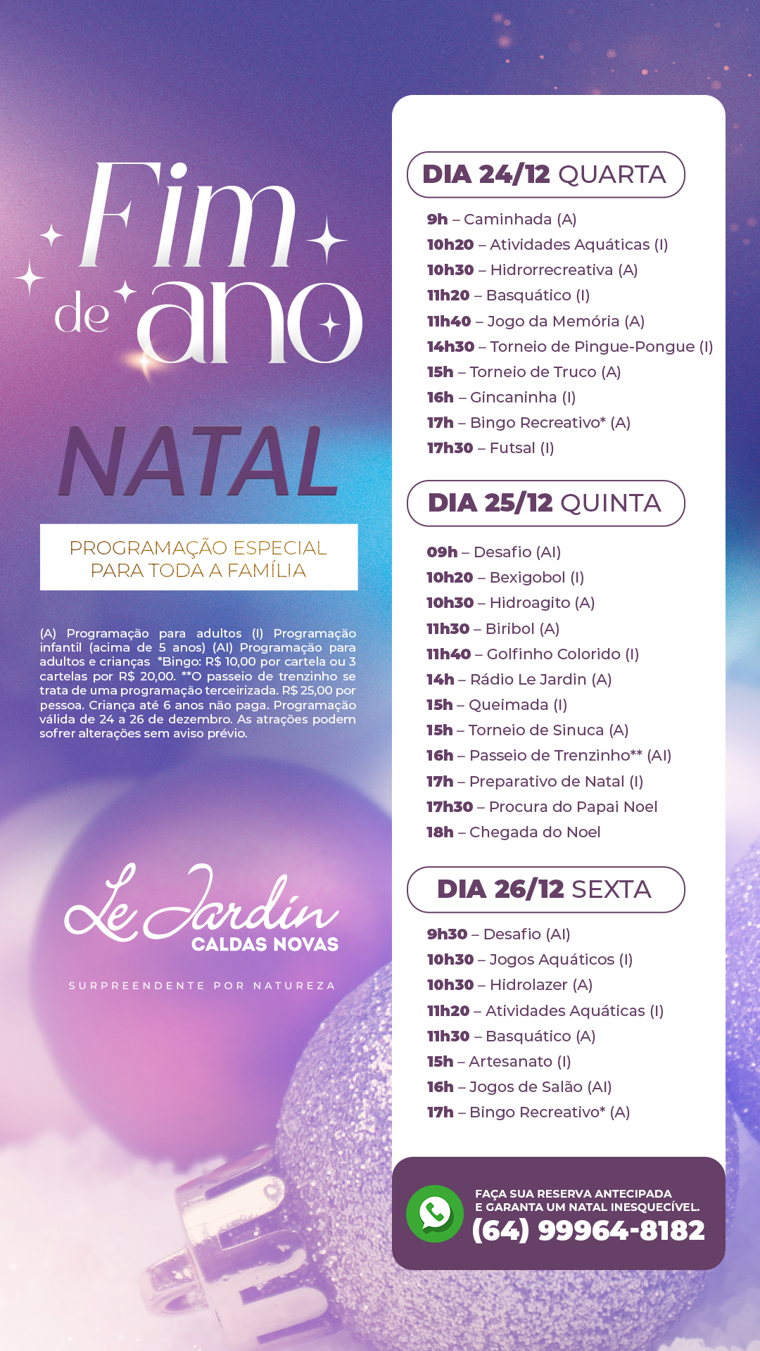 Faça já sua reserva e viva o inesquecível com a gente. 🎉 Lazer para crianças e adultos. ☀️ Águas termais relaxantes. 🍾 Ceias surpreendentes. 🎤 Música ao vivo no Réveillon. ⚽ Jogos, torneios e muito mais.- Confira a programação de atividades para toda a família durante o Natal clicando aqui.